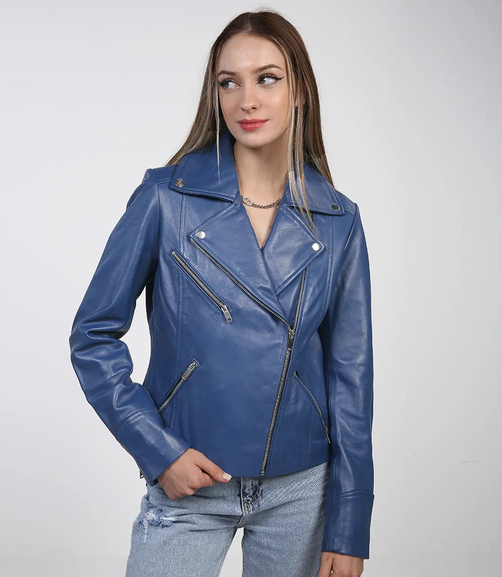 Présentation de la veste de motard asymétrique bleue en cuir pour femme Ninfa : un mélange harmonieux d'allure classique et de touche contemporaine, où le style s'entremêle parfaitement avec une attitude audacieuse.